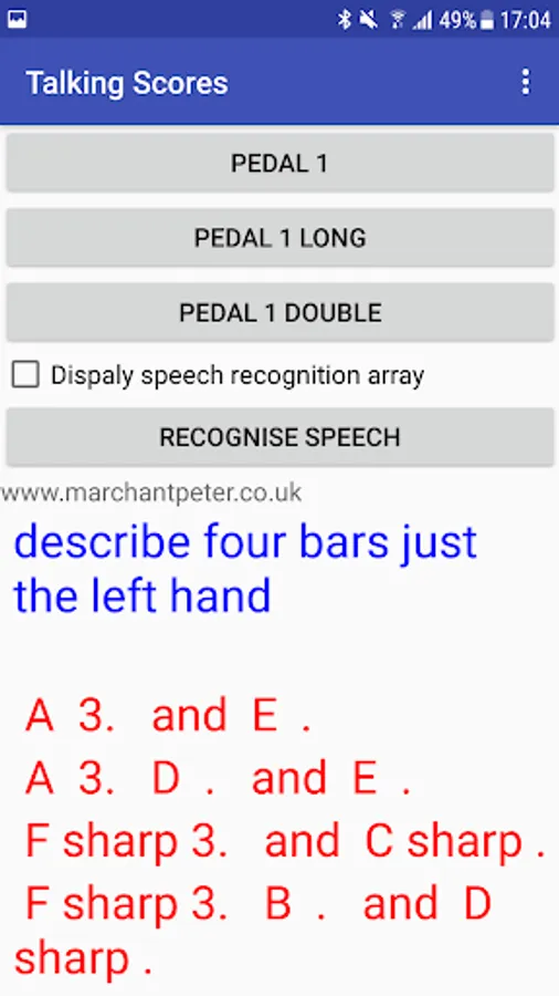 The rest of the screen below has a scrollable area which displays the results from speech recognition (in blue and green) along with any description of the music which the app provides (shown in red).
