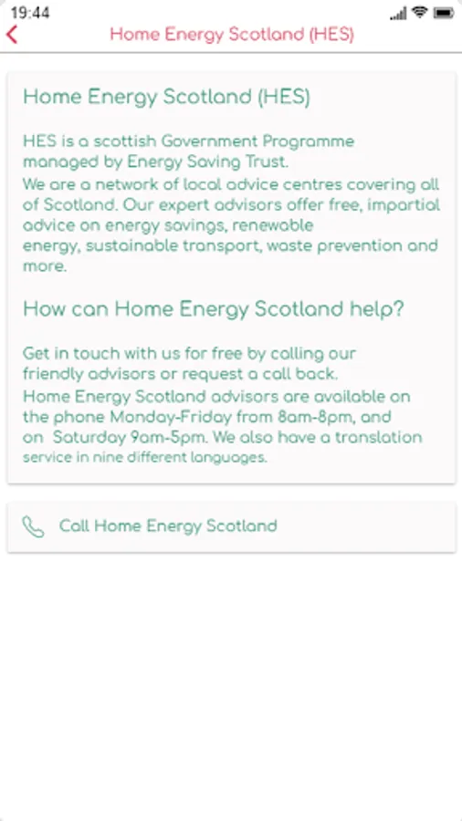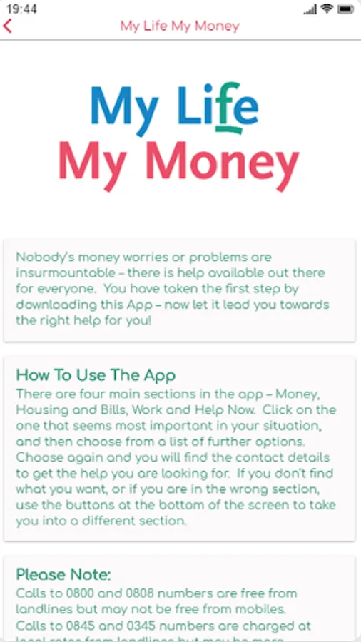 There are four main sections in the app – Money, Housing and Bills, Work and Help Now. Click on the one that seems most important in your situation, and then choose from a list of further options. Choose again and you will find the contact details to get the help you are looking for. If you don’t find what you want, or if you are in the wrong section, use the buttons at the bottom of the screen to take you into a different section.