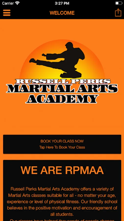 The Russell Perks MAA App will include an About Us Section, Information on Classes including booking system, Links to all Socials, Loyalty cards, Contact & Enquiry Forms & Much more, all to increase branding and customer engagement.