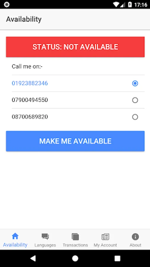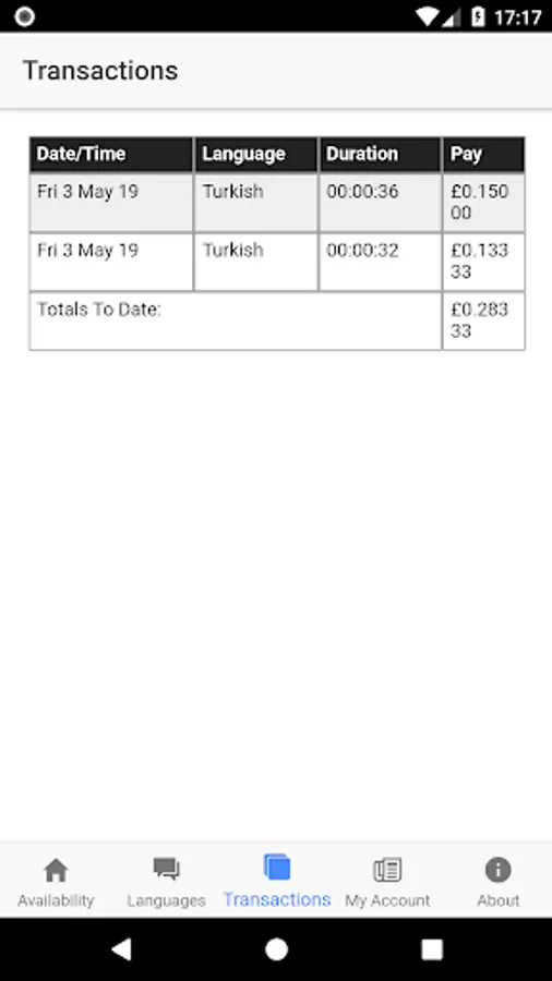 The CVInterpreter App allows Interpreters to manage their availability from their mobile phone. The App also allows Interpreters to view their account details and the transactions for the last month.