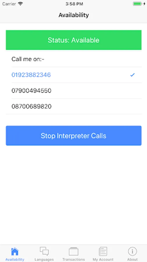 The ILInterpreter App allows Interpreters to manage their availability from their mobile phone. The App also allows Interpreters to view their account details and the transactions for the last month.