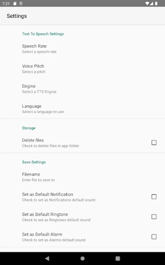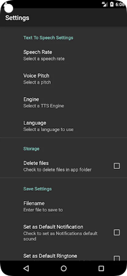 Settings include voice selection/voice speed/voice pitch/tts engine/email/alarm/notification/ringtone.