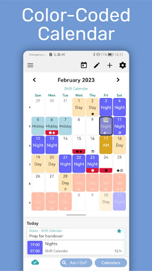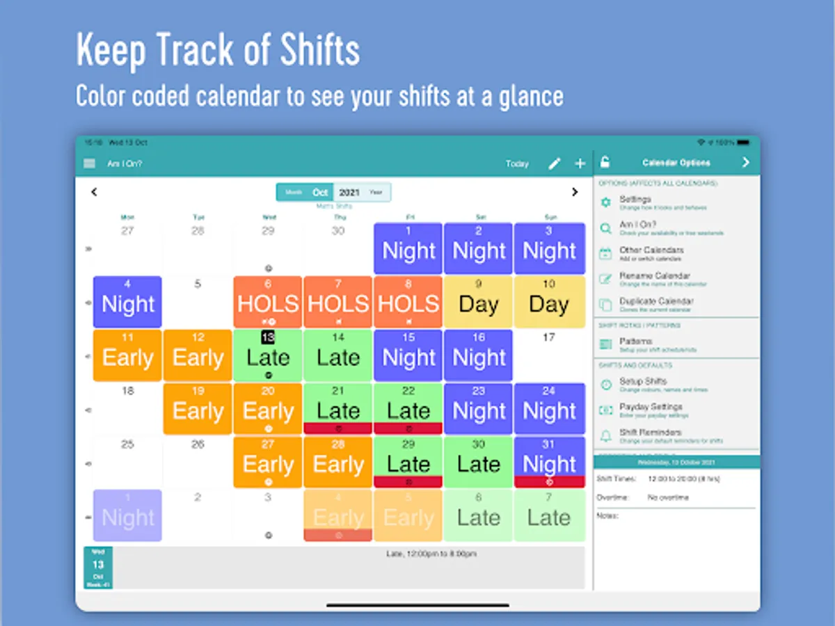✅ See your shift schedule in an easy-to-use color-coded calendar