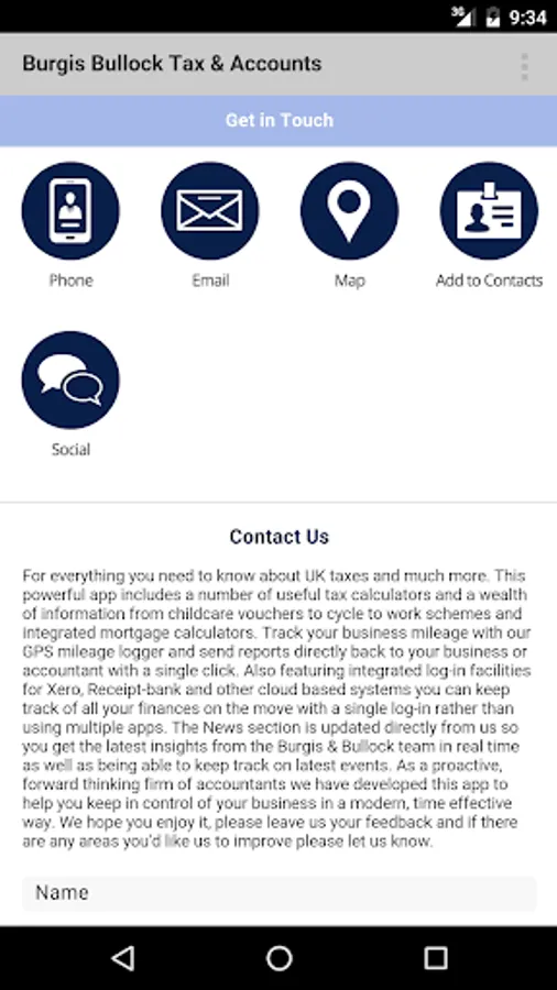 You also get instant access to the latest business and personal accountancy facts, key dates and tax updates. Using the latest technology, the ‘News’ section will be updated directly by us, so you get the latest news, views and offers from Burgis Bullock: Tax & Accounts - in real time, all through your App.