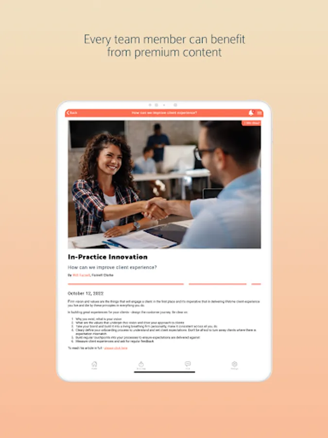 Even with great leadership, without the whole team being on-board, aware of, and continually up to date with best practice thinking across the spectrum of practice development - then progress is going to be harder than it needs to be. The good news is that people want to be involved. With the average age of a team-member within an Accounting and CPA firm now being below 40, and culture of a desire for all to be involved and included on the 'journey' - then get your team, your colleagues (and your bosses!) to download this free App.