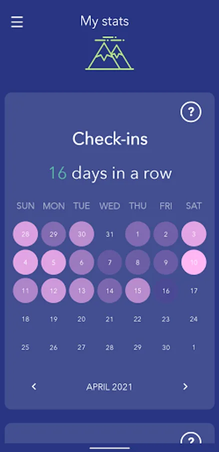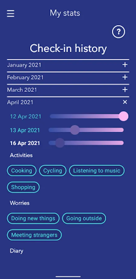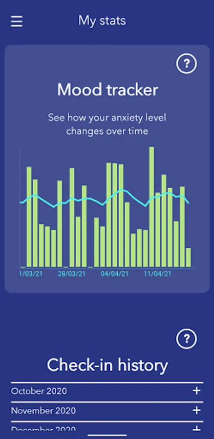 Molehill Mountain allows you to track your worries and identify the situations that trigger your anxiety. Your daily check-ins are plotted on a chart which allows you to identify pattern and trends – and you can also display a previous check-in to help you identify recurring triggers for your anxiety.