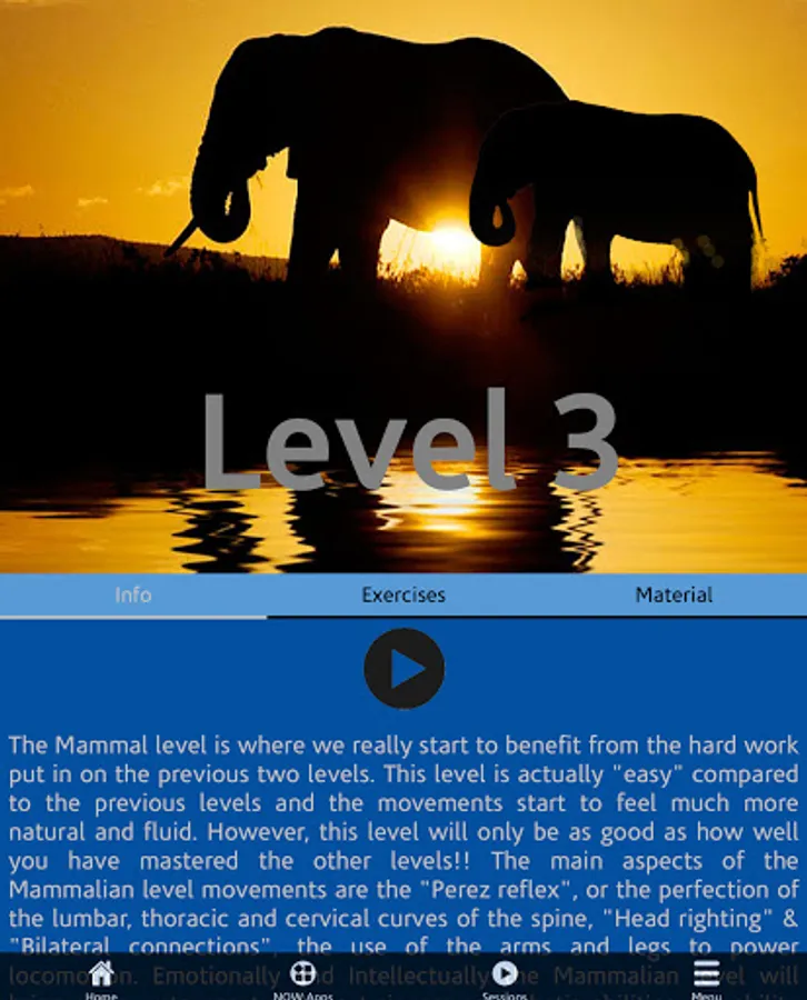 Level 4 - Human - Our special neuro-programming includes bilateral walking and, more importantly, the Perez Reflex, responsible for the forming of the human lower back lumbar curve. Improving this important neuro-postural alignment brings positive postural improvements and reduces back and hip pain, including extreme PMS symptoms while releasing one's true deeper essence.