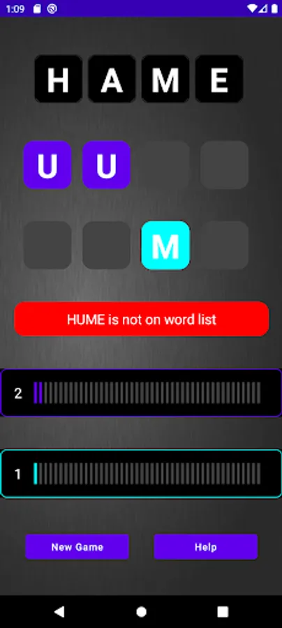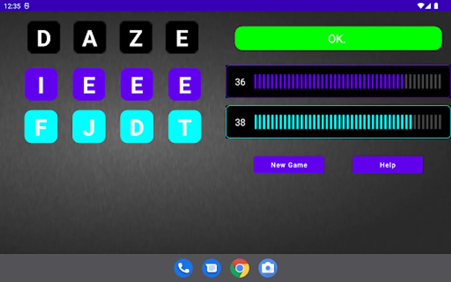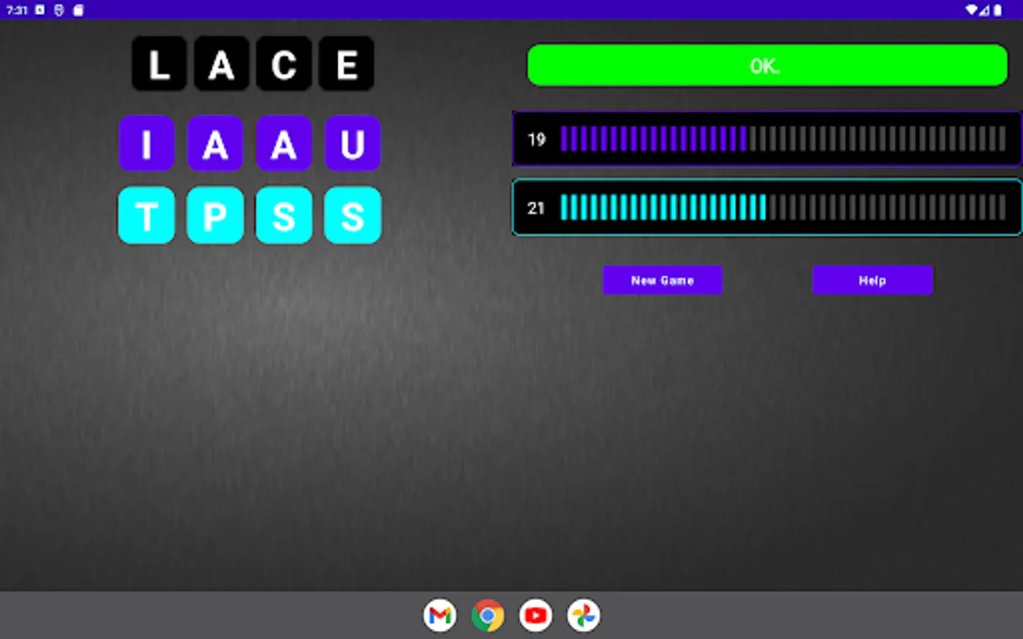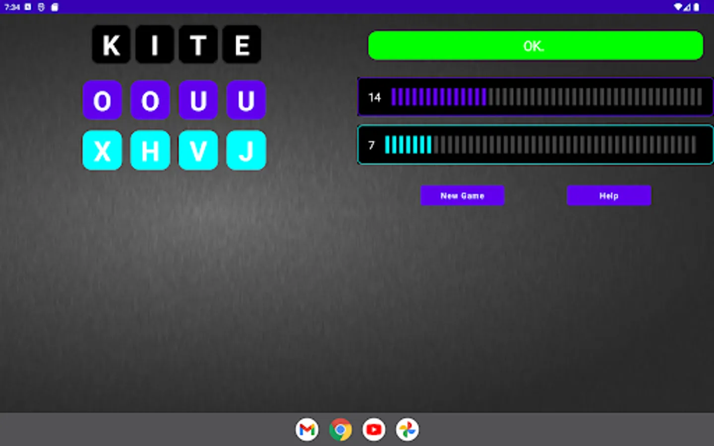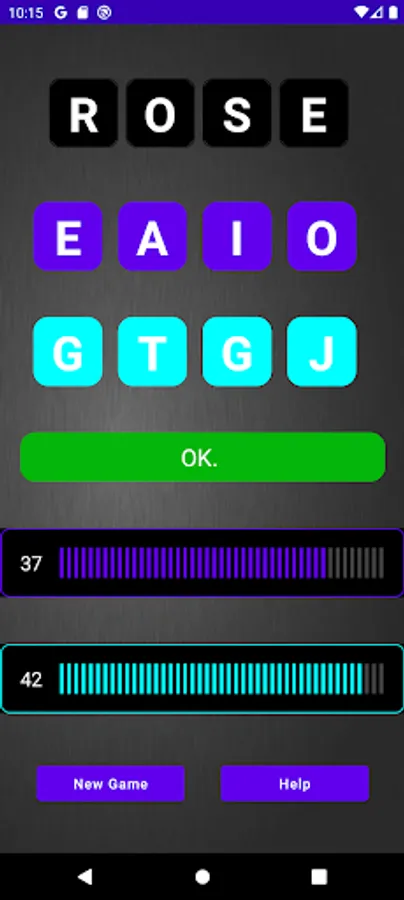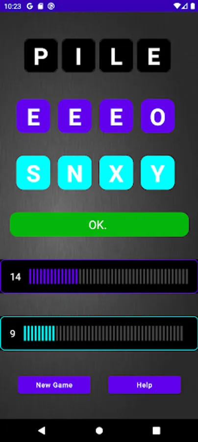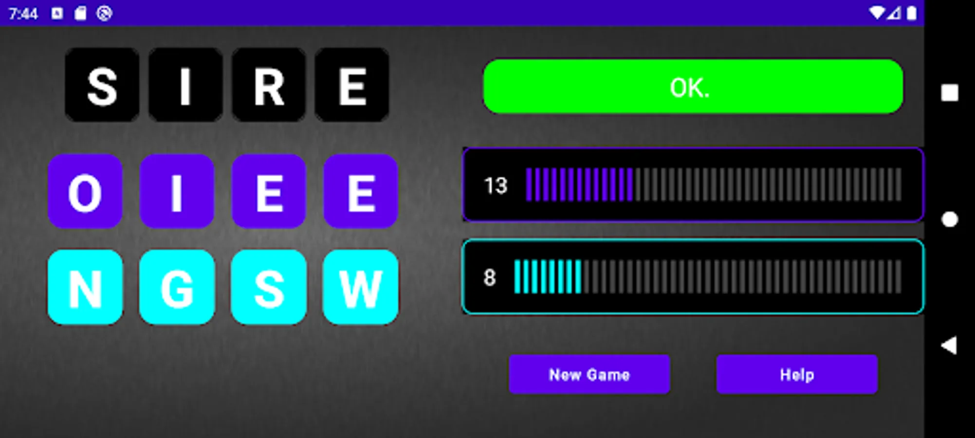 A colored bar on the screen indicates if the word created is acceptable (green) or not (red). The acceptable word list is based on the Shorter Oxford English dictionary. It includes a number of slang, colloquial, abbreviations and swear words, but not all! Some words judged offensive or derogatory have been excluded. The game is only suitable for English language speakers.