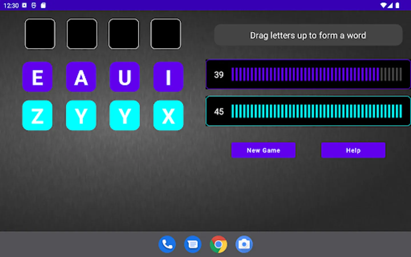 Create a four letter word from a starting selection of four consonants and four vowels (the letters used are then replaced from the appropriate deck). Continue by changing ONE letter to make a new word. The aim is to use ALL the letters by changing each word one letter at a time making new words (a bit like a word ladder). Letters are replaced from the appropriate deck as they are used. Counters on the screen indicate how many letters remain in each deck.