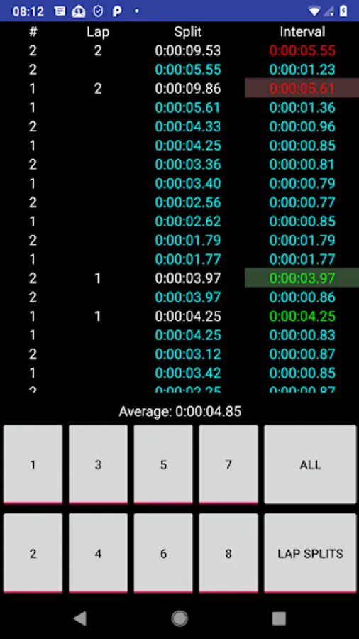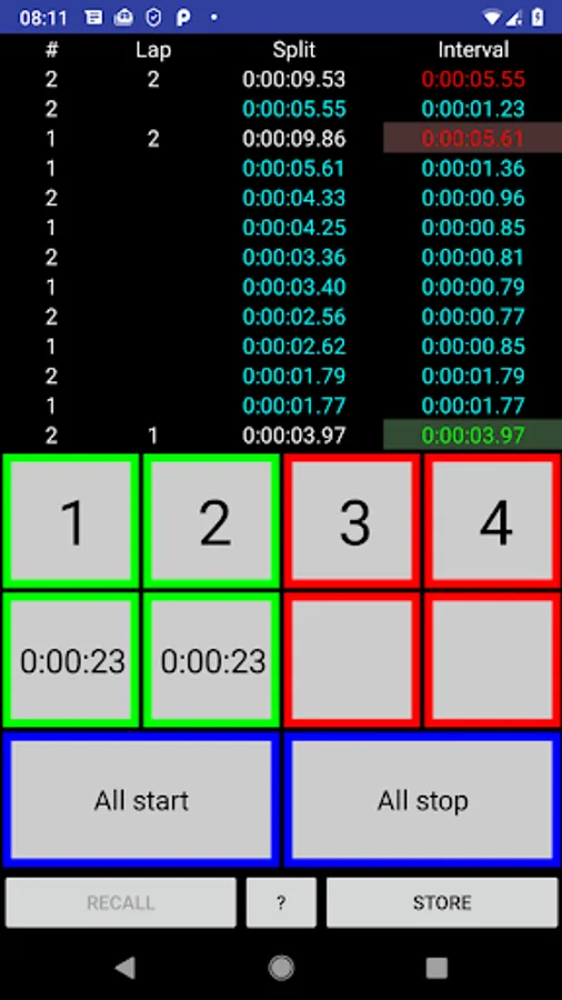 Multi-stopwatch can also be configured for 4 timers only where each timer can not only record split and lap times as above, but also splits and intervals within each lap. (In this case the volume buttons are for timer 1 only - up for lap times, and down for lap split times).