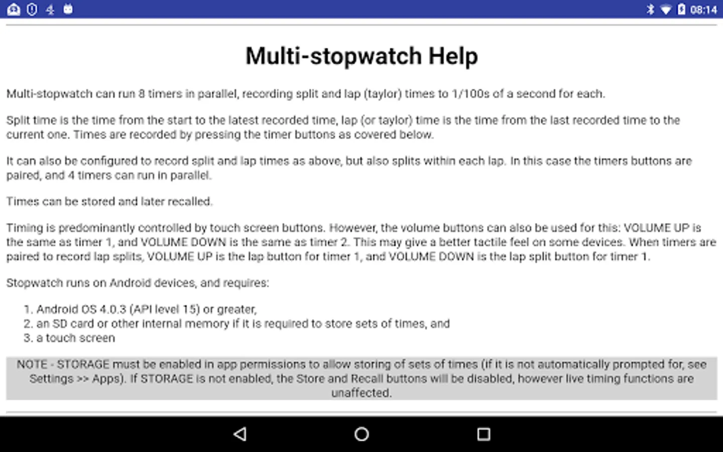 Multi-stopwatch runs on phones and tablets running OS 4.0.3 (API level 15) or later.