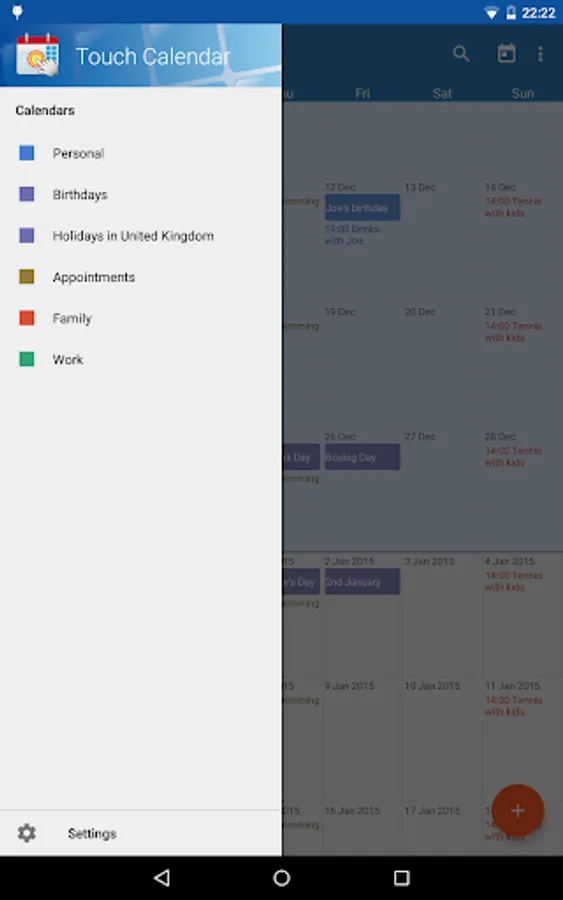 Note: Text colour for events comes from the calendar colour. Set up different calendar colours in Google Calendar and they'll appear in Touch Calendar automatically.