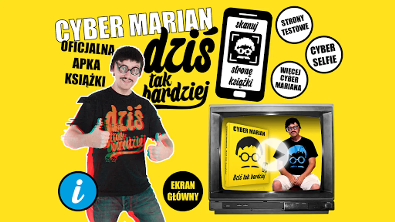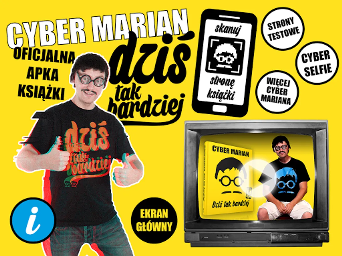 Wkrocz w nowy wymiar książki DZIŚ TAK BARDZIEJ Cyber Mariana! Dzięki tej apce i Cyber Rzeczywistości Rozszerzonej uzyskasz dostęp do ukrytych w książce materiałów, których nie znajdziesz nigdzie indziej! Ale nawet jeśli jeszcze nie masz książki DZIŚ TAK BARDZIEJ, to ściągnij tę apkę, bo i tak będziesz mógł z niej skorzystać! Po pierwsze – są w niej dwie przykładowe strony z książki, które wykorzystasz do testów, by przekonać się, jak świetnie działa Cyber Rzeczywistość Rozszerzona. Po drugie – zrobisz sobie z zdjęcie z Cyber Marianem (serio!) i łatwo wrzucisz je do sieci. A po trzecie – szybko przejdziesz na kanał YouTube Cyber Mariana, by móc obejrzeć jego najnowszą produkcję. Udanej zabawy!