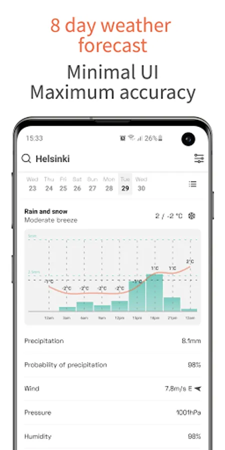 OpenWeather App is an ad-free & free-to-use application that will help you plan your time around the weather in a concise and minimalistic manner. Be aware of any precipitation within an hour with a minute precision or plan your activities for the next Sunday morning. OpenWeather App can tell you, which part of the day is going to have a clear sky and light breeze perfect for a run or bike ride for 7 days ahead.