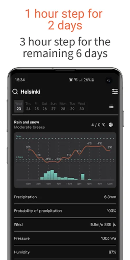 4. Hourly weather chart for the first 2 days and for every 3 hours in the following 6 days;