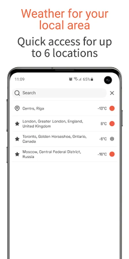 - Add up to 6 cities to your favourites and get the accurate weather forecast for any location;