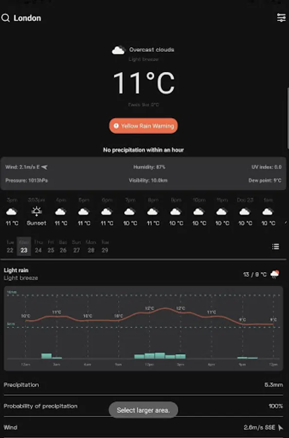 5. Expand any day of the week and get a visual chart on temperature and detailed weather information for the day, plus Sunset/Sunrise time. The first 2 days come with an hourly temperature fluctuation chart;