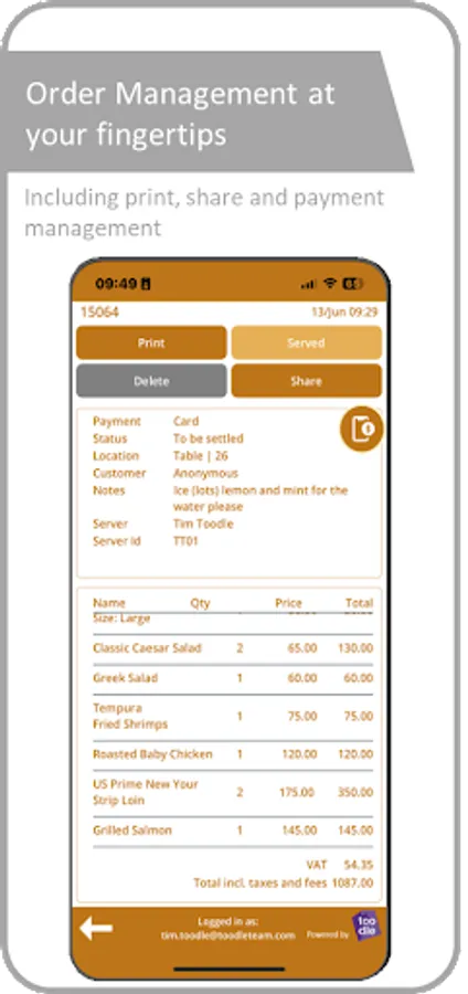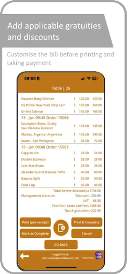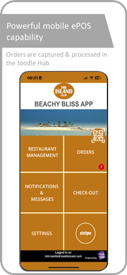 Registered toodle merchant users use the toodle Hub to process orders, engage with users, manage their catalogue or menu, publish promotions, run daily reports, and, if applicable, supervisory staff can perform certain restaurant management functions - eg assigning waiting staff to tables.