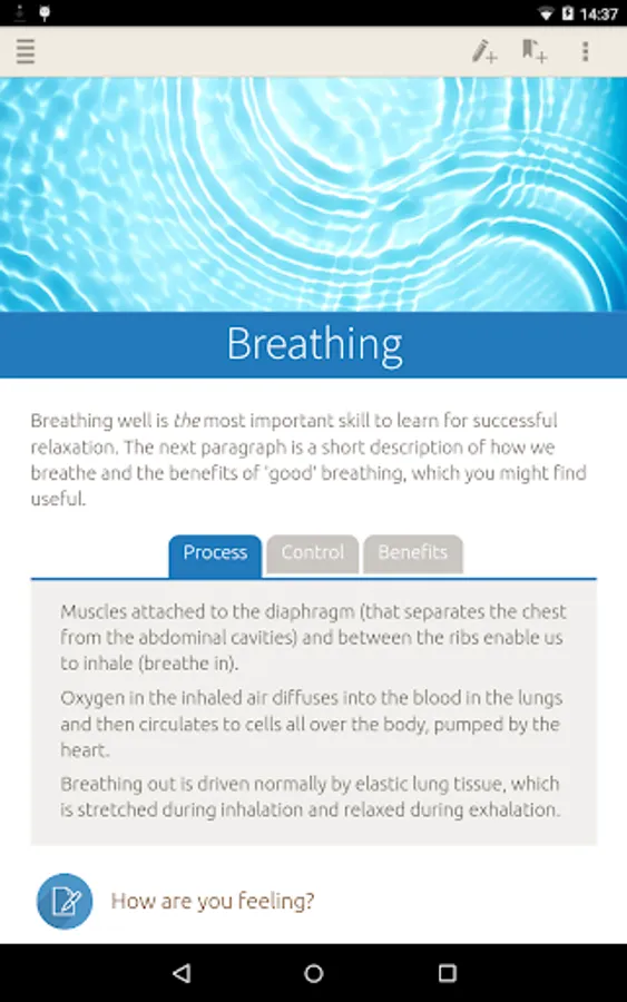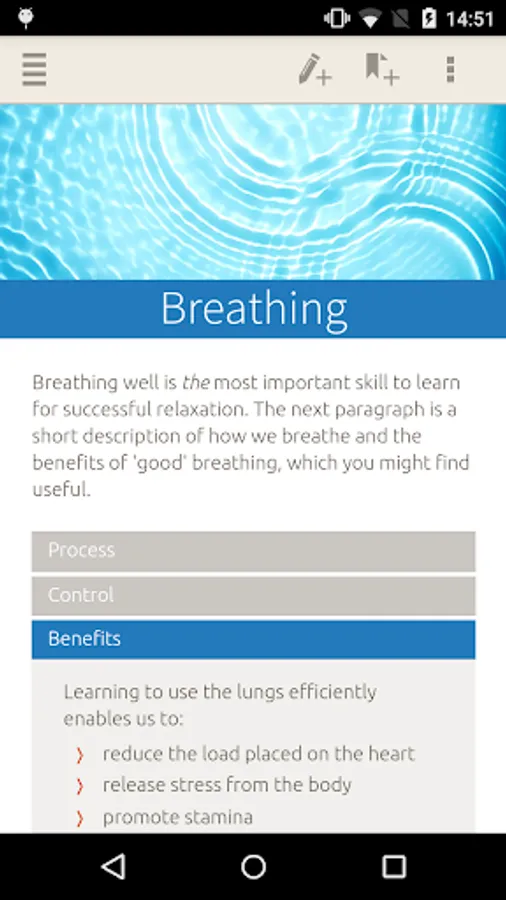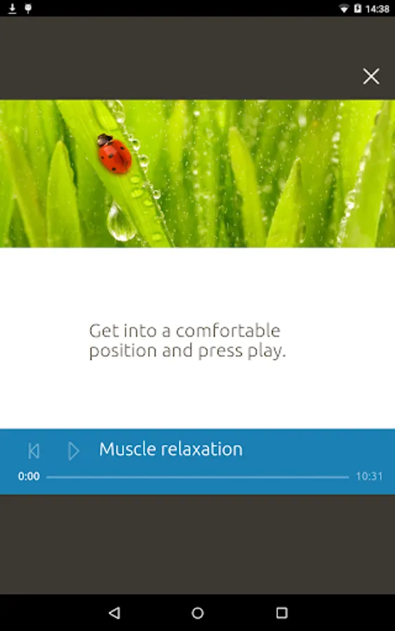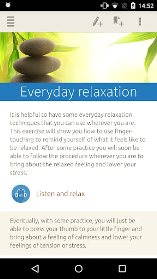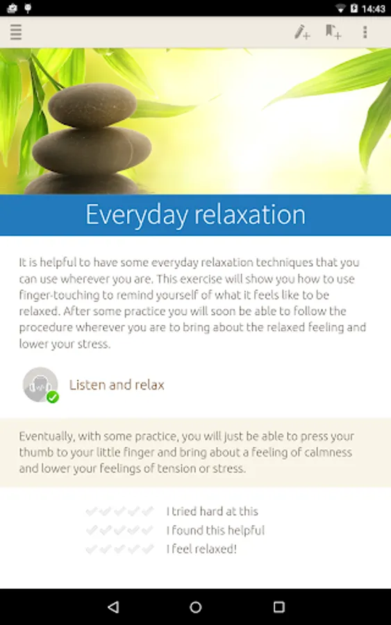 Relaxation features a series of everyday exercises to help you relax and feel more in control. Discover breathing techniques and visualisation tools to help you become more calm and mindful in your everyday life.