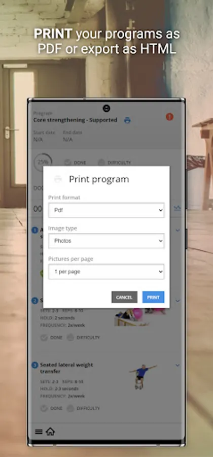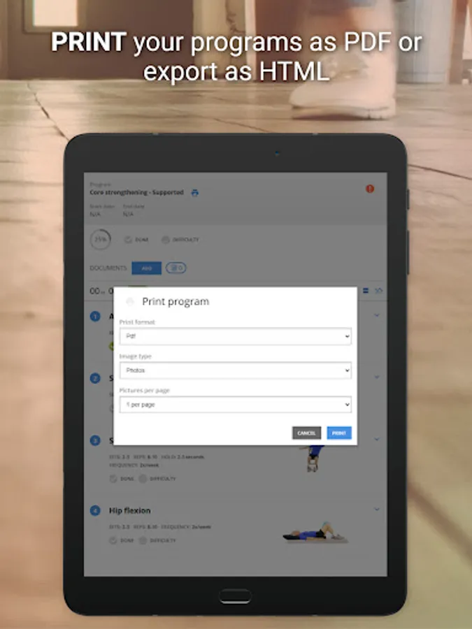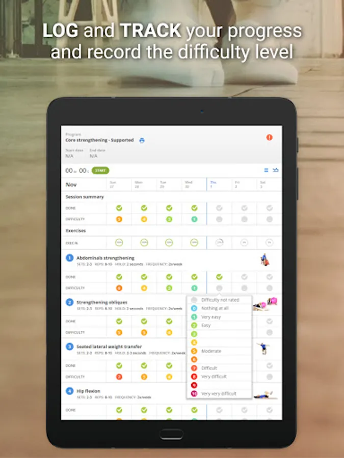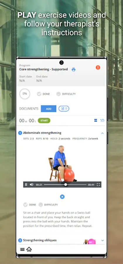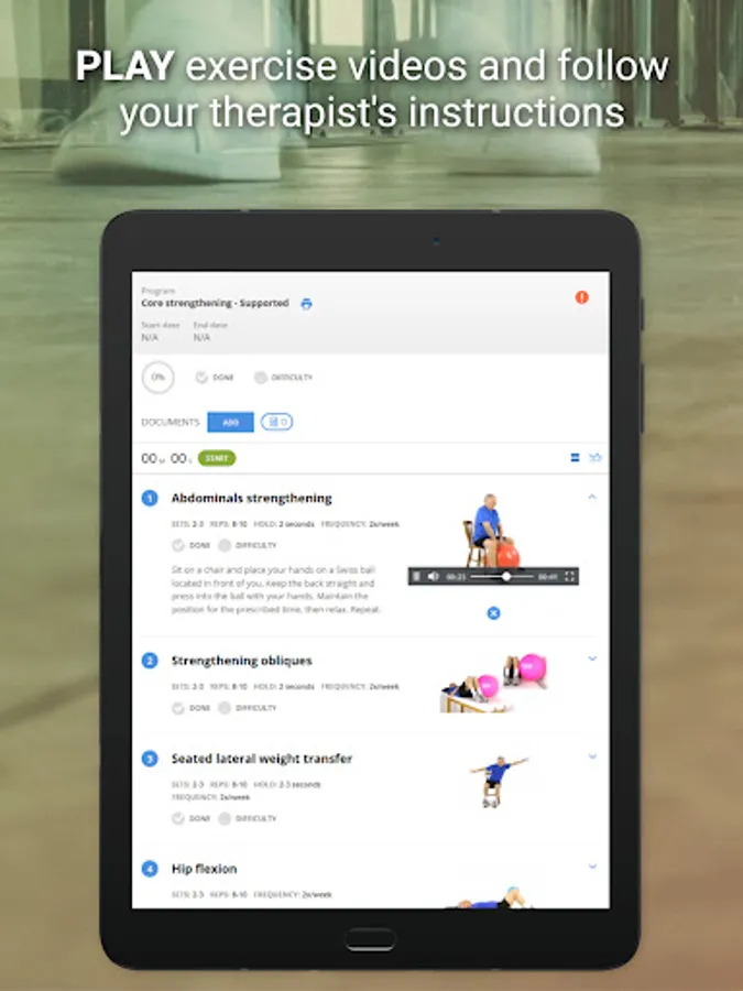 The app provides you with high quality HD videos of your rehab exercises prescribed by your physician, physiotherapist or other healthcare professional. All exercises have been filmed using a best practice educational video production process. That means no more guessing if your technique is correct, because you can perform the exercises along with our professionally trained models.
