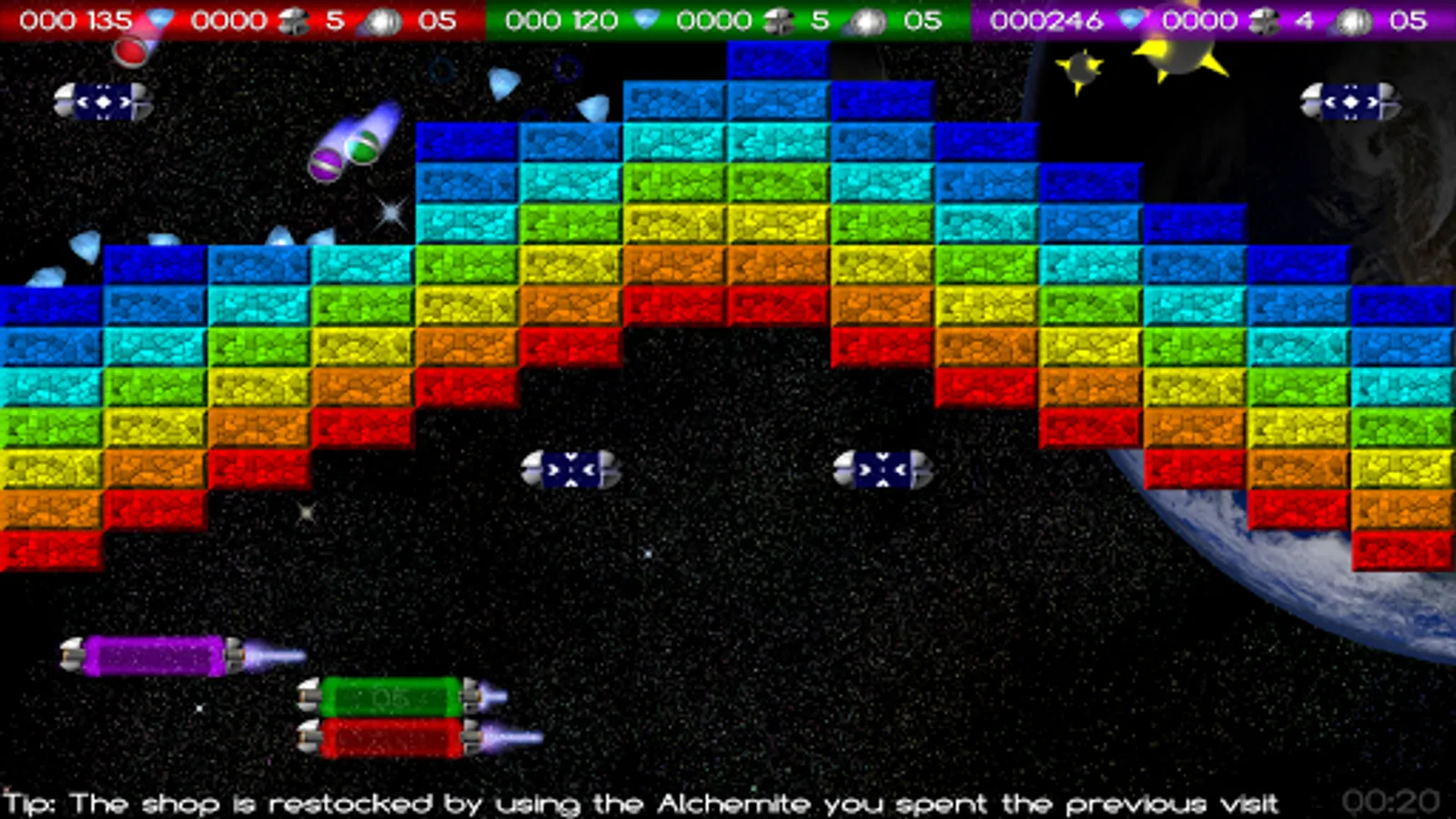 Very challenging brick breaking retro action with permadeath, weapons, resource management, farming, shop, sub-games. Farm Alchemite by destroying each level with your balls, or purchase weapons to help. Mysterious power-ups. Navigate through sub-games. Buy extra ammo, balls and lives to help you progress through increasingly difficult levels. Fun played solo or up to 3 players local multiplayer with game controllers supported.