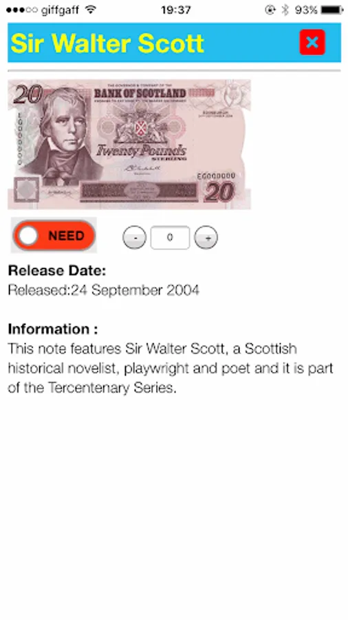 Note collecting application for those interested in UK note denominations. Each note has a detailed image, some informative text, and the ability to mark as collected.