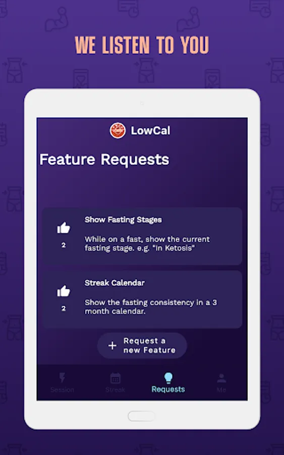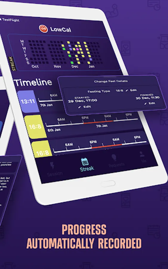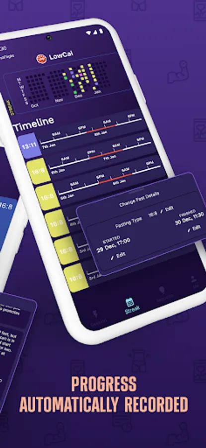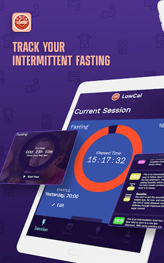 Our app, LowCal, helps you stay on track with your fasting goals, providing simple and intuitive tools for logging your fasting times, tracking your progress.