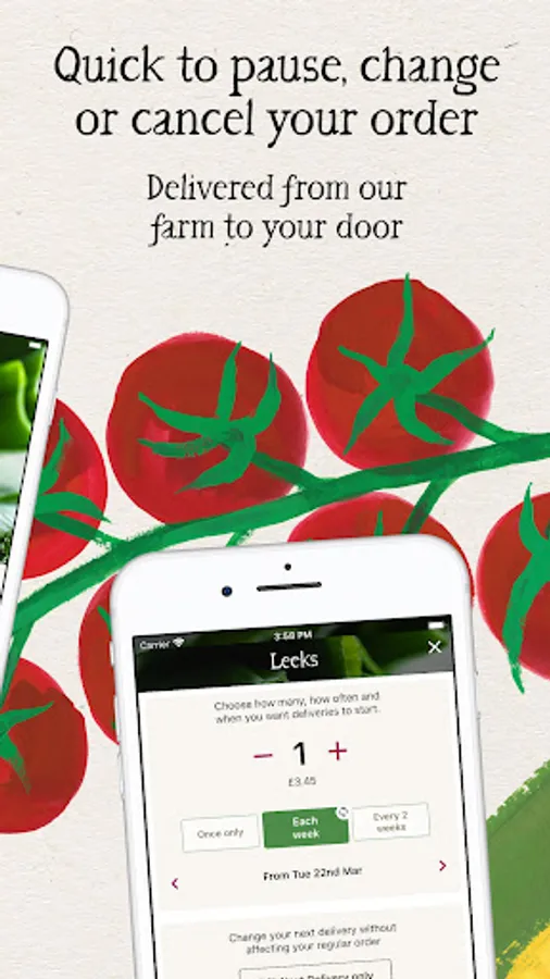 Riverford’s easy order app is the fastest way to buy seasonal organic veg. Shop when and where you like, and never forget your avocados again! Brilliantly designed with our customers in mind, it makes managing your order simple.