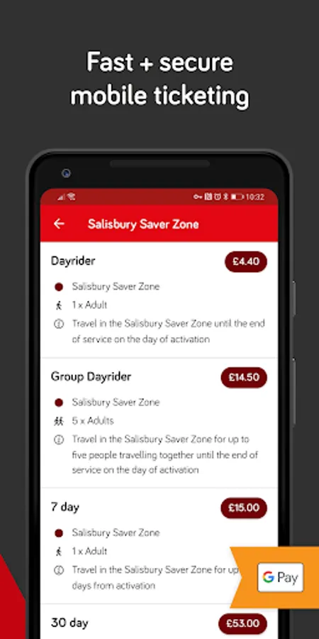 Mobile Tickets Purchase mobile tickets securely with a debit/credit card or with Google Pay and show the driver when boarding - no more searching for cash!