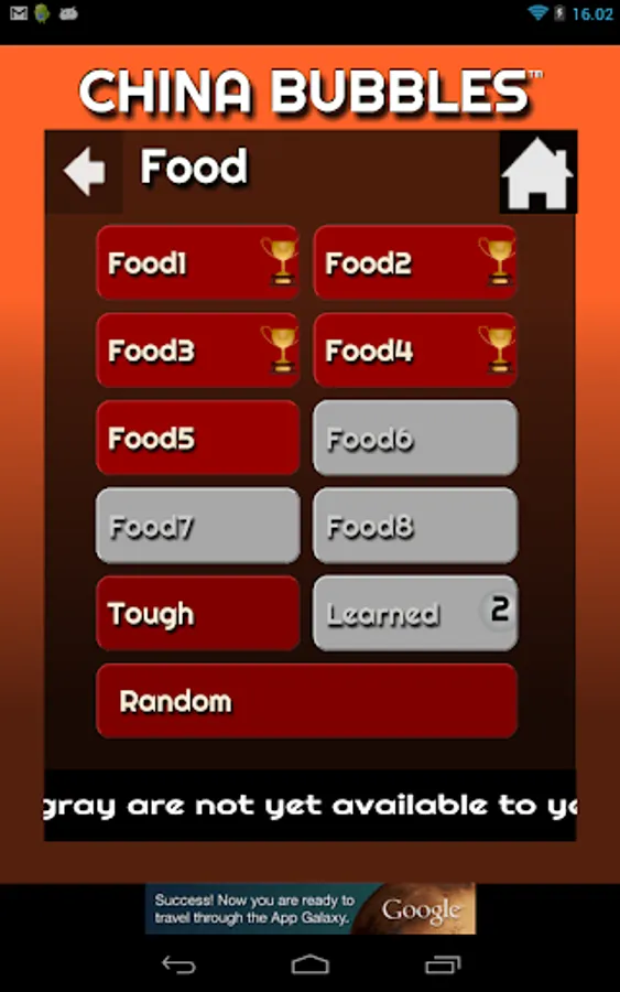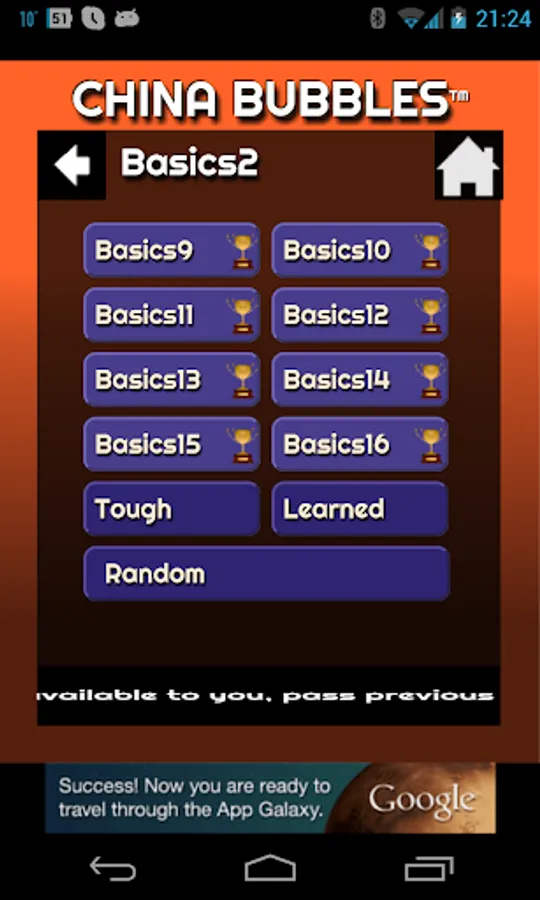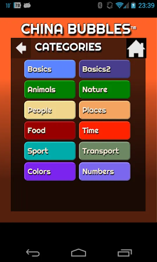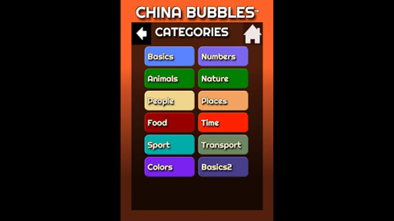 CHINA BUBBLES is a simple yet powerful learning game that helps you get to grips with Mandarin Chinese vocabulary. Instead of suffering your way through a dry teach-yourself-Chinese book, you can blast bubbles, earn trophies and compete with friends, learning all the time!