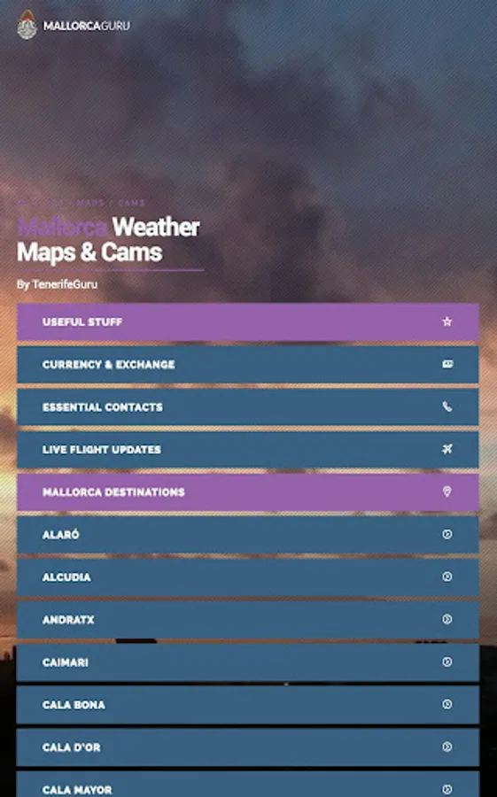 Updated for 2020. Now book all your trips and excursions in-app. MallorcaGuru presents Majorca info including Weather, Maps & Webcams with localised 7-day weather forecasts and updated webcams for all major (and minor) destinations on the island. The app includes a real-time currency converter to let you see prices in your own currency as well as updated exchange rates. Also includes live flight updates (arrivals and departures) from Mallorca (Majorca) airport (Palma de Mallorca Airport).