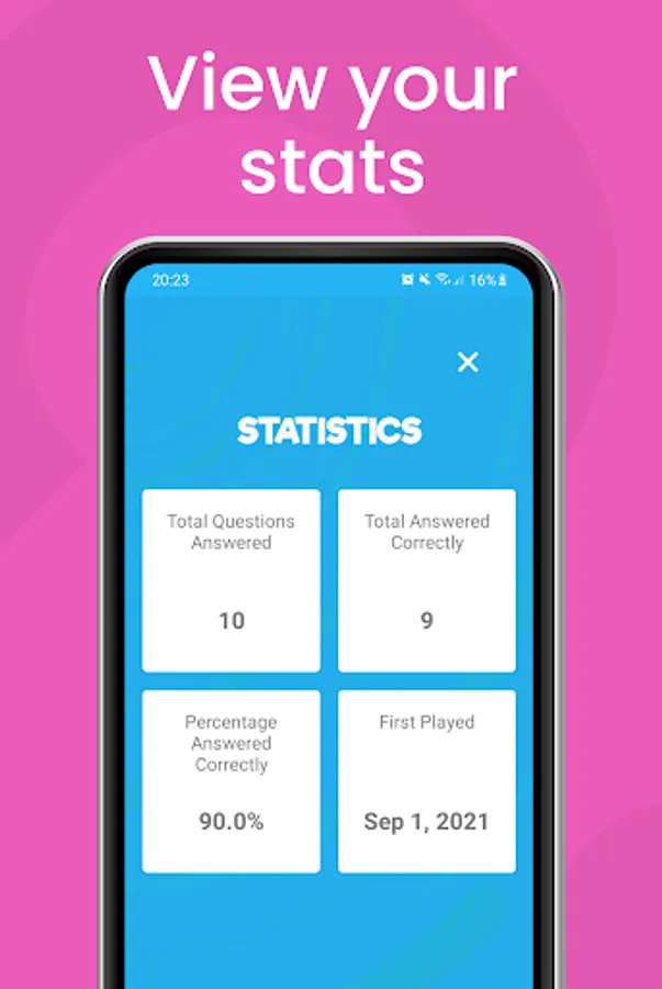 - You have your own custom statistics page, showing how many questions you've answered, how many you've got right, and how long you've been playing our quiz app for.