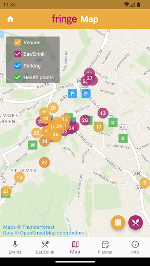 - Includes a map for all venues, car parks and health points, and directions from your location.