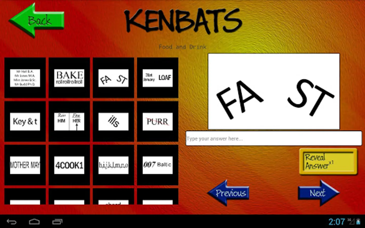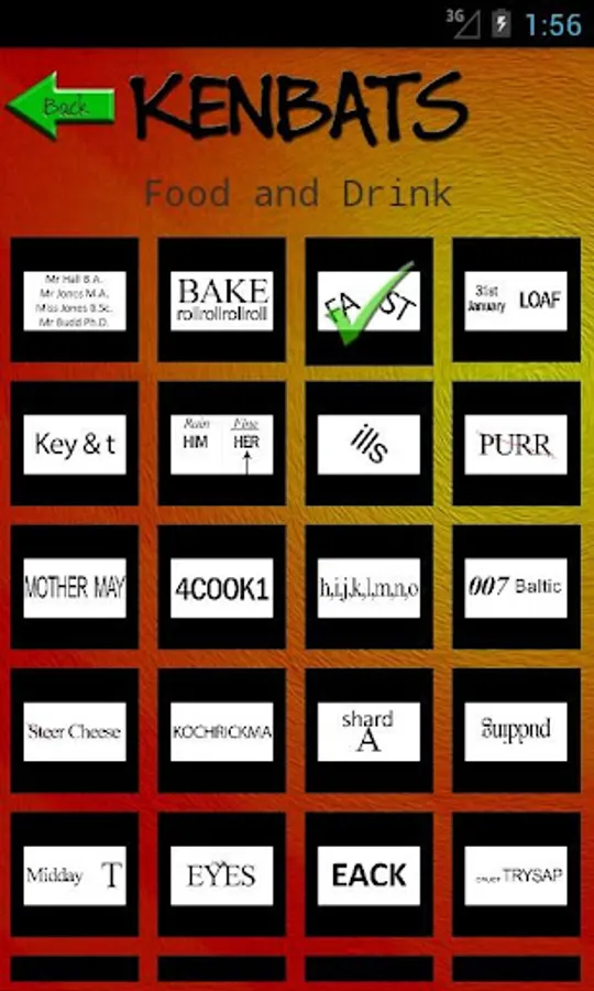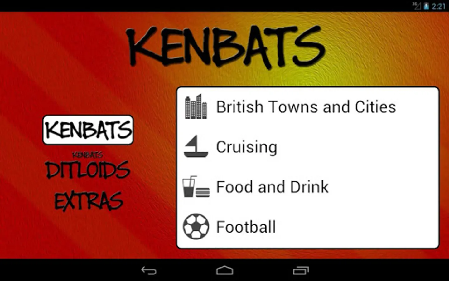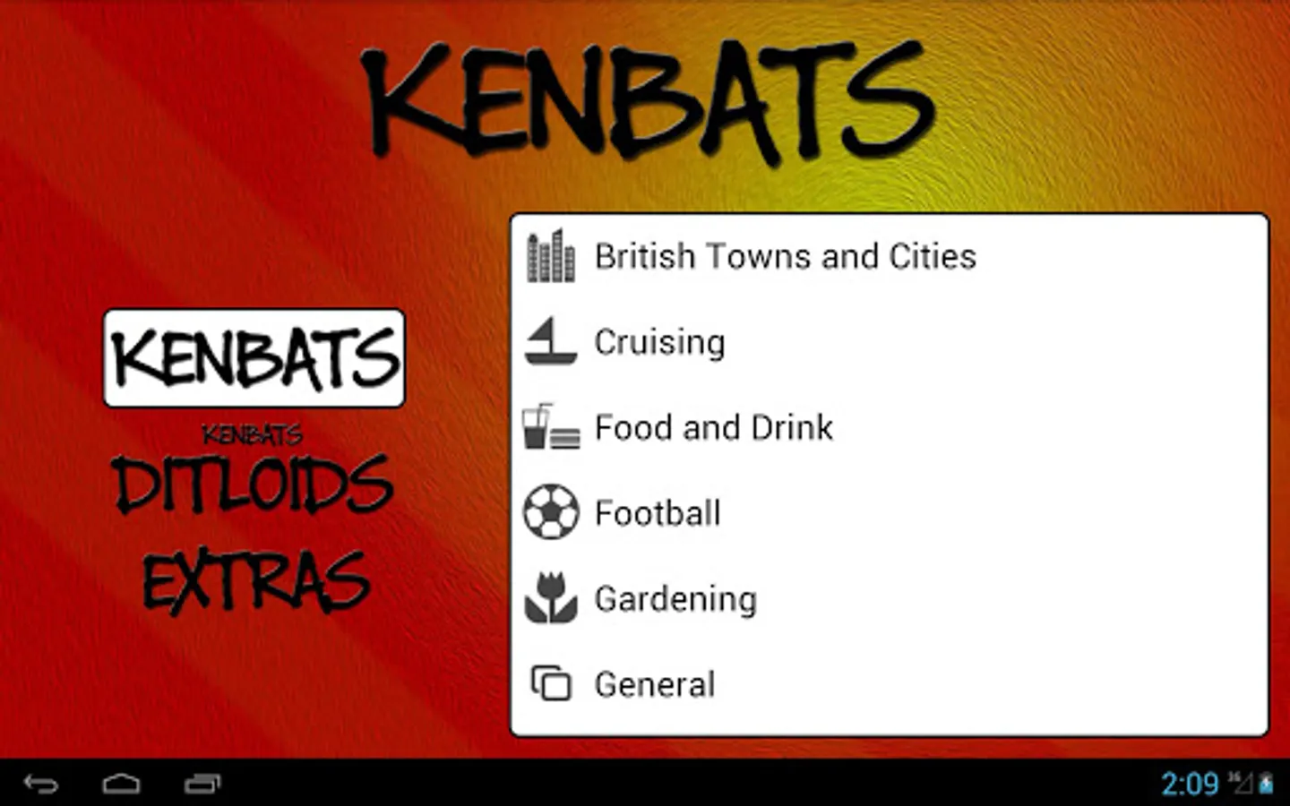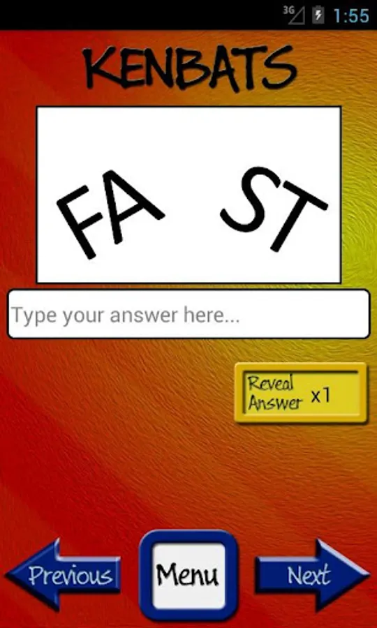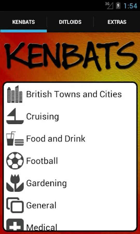 Kenbats features hundreds of word-based puzzle images, all categorised and ready to twist your mind. Can you figure them all out? Covering categories such as towns and cities, football, as well as hundreds of general knowledge subjects, there's something for everyone. In addition there are dozens of DITLOID (alpha-numeric) puzzles to drive you even crazier and keep you busy for all 7 = D of the W, 365 = D in a Y.