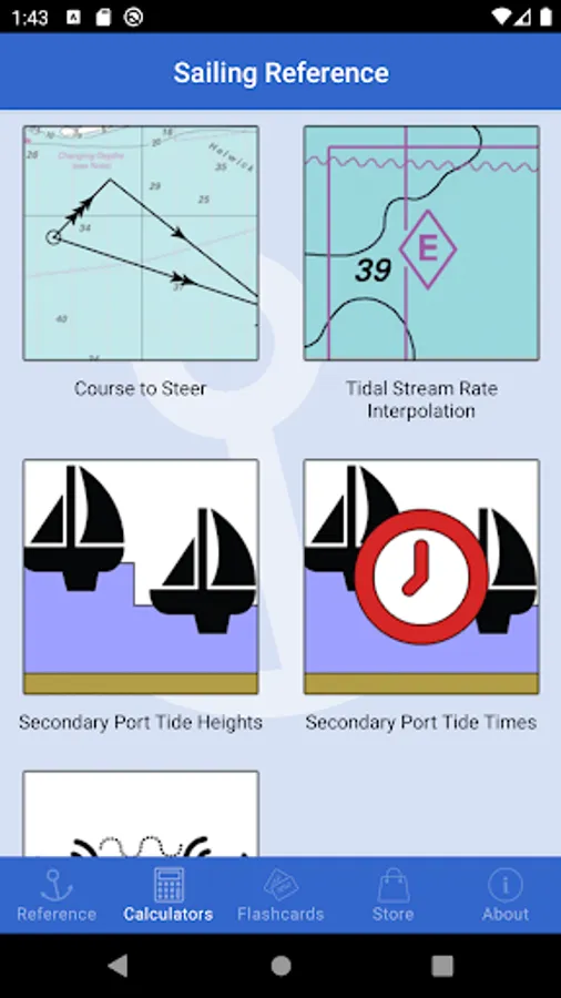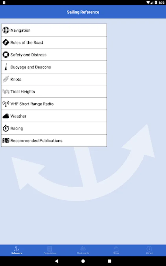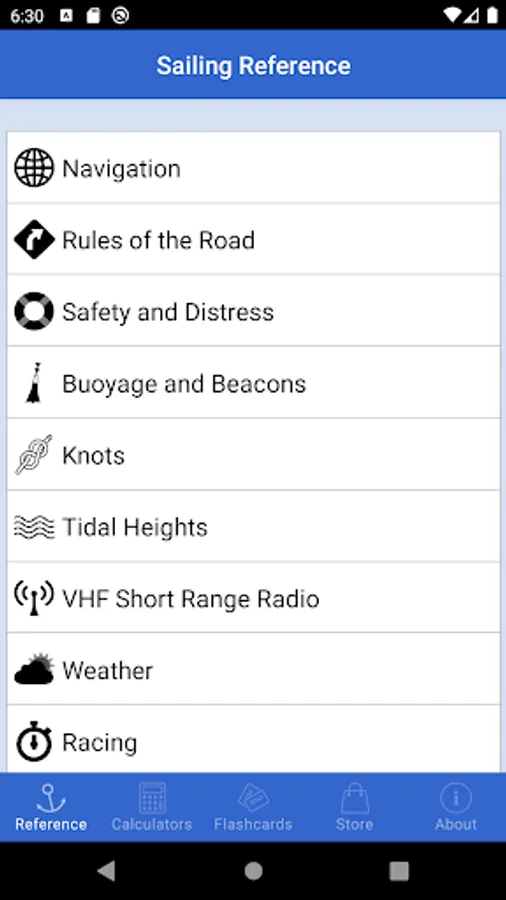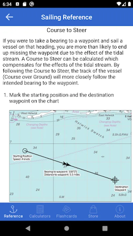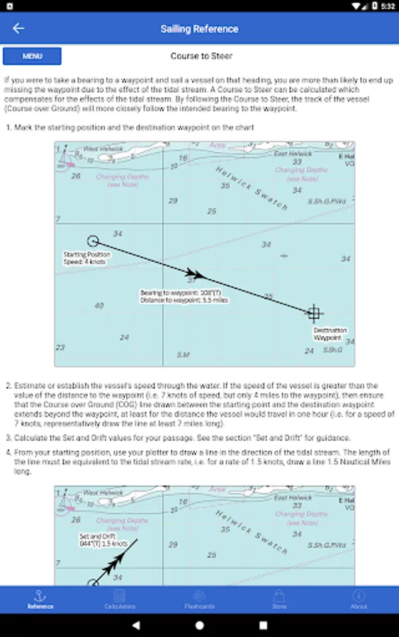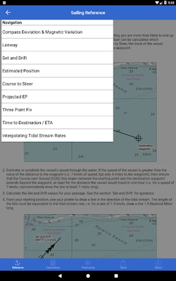 Sailing Reference is the comprehensive reference guide for all of your nautical navigation needs. Ideal for beginner and seasoned sailors, the app contains information crucial to passing the various RYA Yachtmaster shorebased navigation and practical courses. All content is fully available offline so is not reliant upon a data connection at all. There are handy calculators for quickly estimating a course to steer, interpolating tidal stream data, calculating times and heights of tide at secondary ports, and estimating VHF radio transmission ranges. The in-depth reference section includes dozens of illustrated and detailed how-to guides covering:
