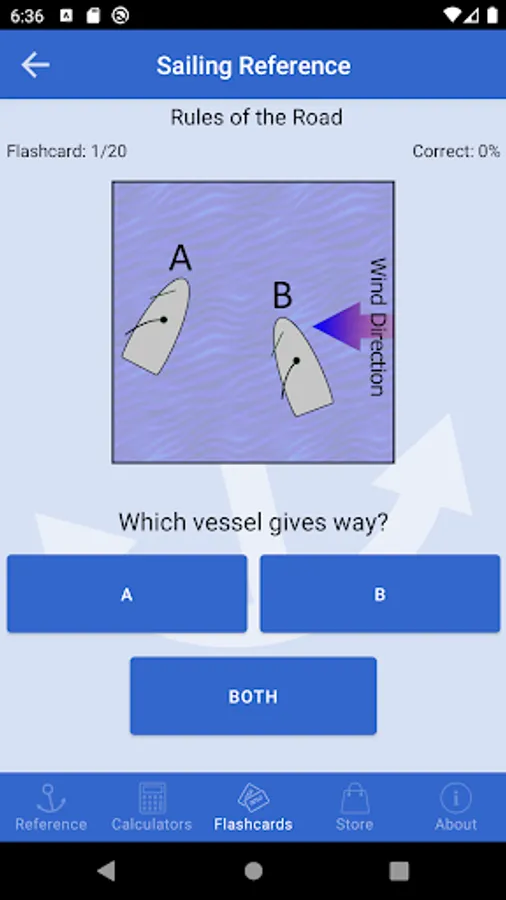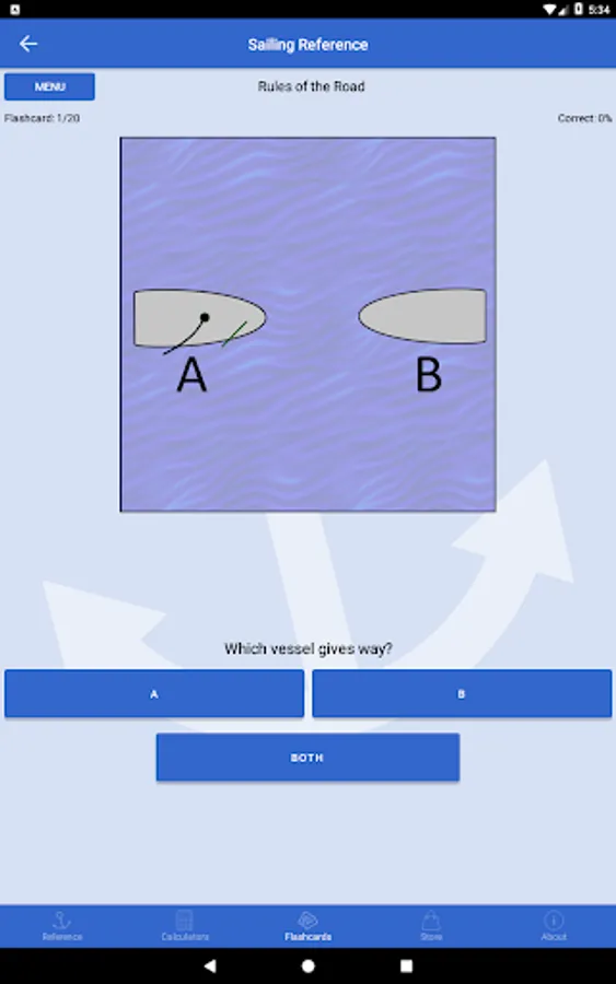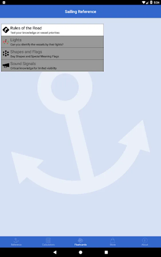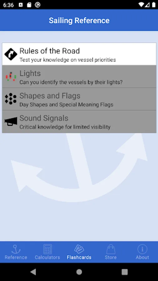 For those who need to brush up on their knowledge of the COLREGs / IRPCS, load up the flashcards for a quick quiz. Included with the app are a set of “Rules of the Road” flashcards covering numerous collision scenarios. Additional flashcards covering vessel lights, day shapes, flags and sound signals are available to purchase in-app as a single add-on pack.