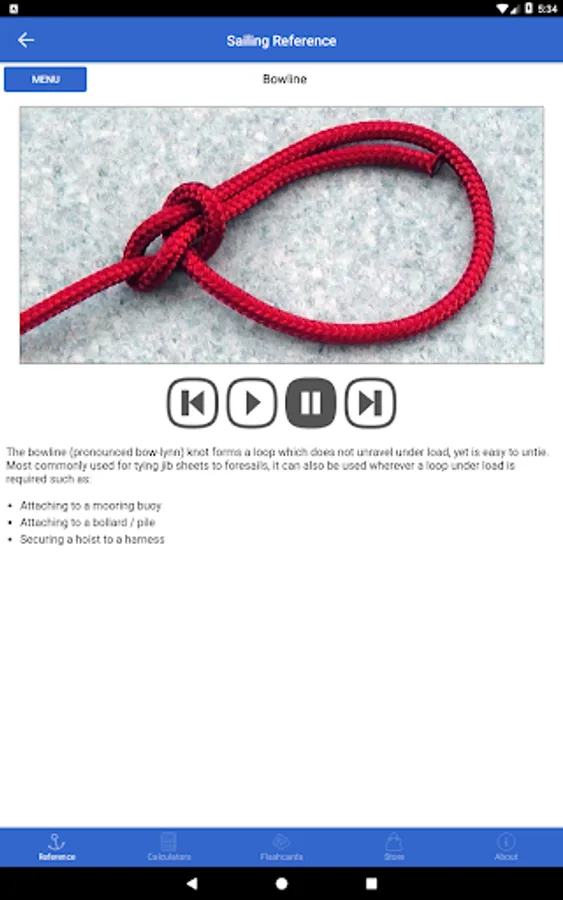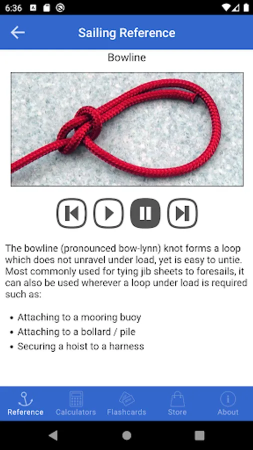 New! Now contains instructional animations illustrating how to tie a number of the most common nautical knots. Each knot is accompanied by a brief description outlining suitable applications. The Bowline Knot is included with the main application, with other knots available to purchase in-app as a bundled add-on.