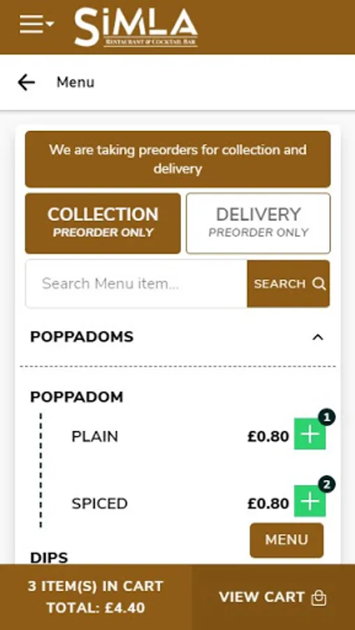 • To order your preferred dishes, you need to open the menu and search your preferred dishes from the search bar or choose your dishes from our menu and then add them to your cart.