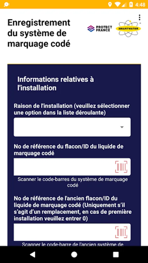 The purpose of this application is to enable the registration of SmartWater Encoded Marking Systems (CMPs) during maintenance or installation.