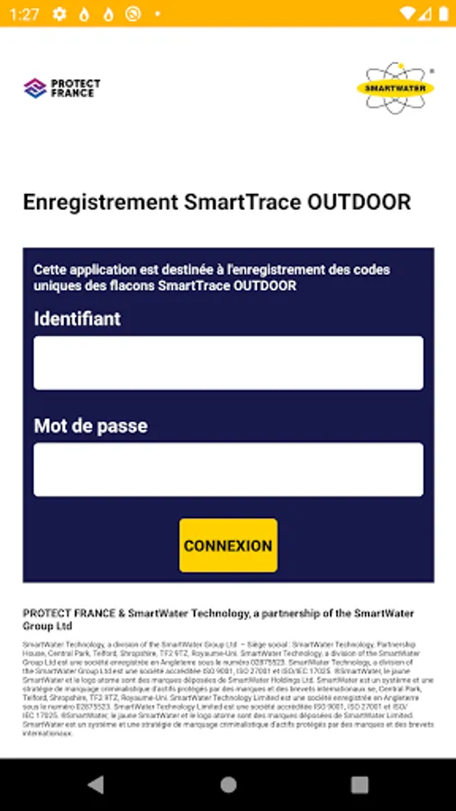 Register the unique code of your SmartTrace OUTDOOR Pack in just a few minutes. All you need to do is open the application, enter your username and password, scan your bottle of SmartWater Coded Marking Product (PMC) and fill in the contact details of the owner of the site to be protected for registration. Once completed, this information will be sent directly and securely to SmartWater's protected database.