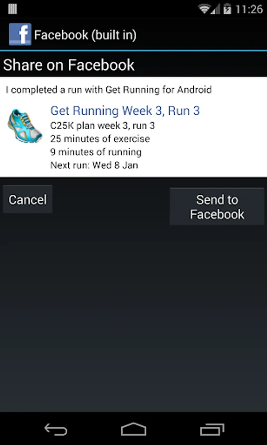 ✔ Publishes your success – send updates to Twitter or Facebook (built-in), and have your friends remind you when the next run is due!