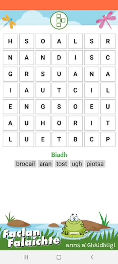 The challenge is to discover hidden Scottish Gaelic words in our easy to use fun learning game. Designed for primary school users our free app features different categories of words organised by theme. All you need to do is to swipe up, down, left, right and diagonally to select the words. Come on, give it a go and have some fun!