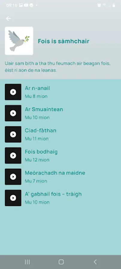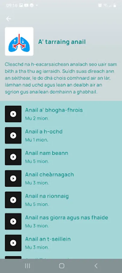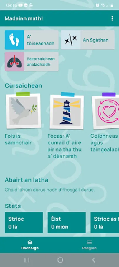 Use this app to interact with your emotions through the medium of Scottish Gaelic. Mothachas has been organised to reflect day-to-day situations and emotional contexts, and it contains a range of recorded meditations and breathing exercises.
