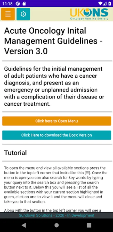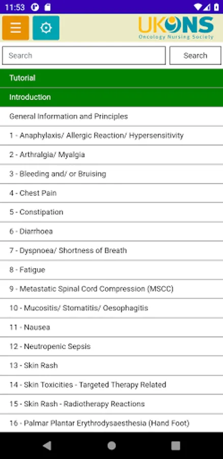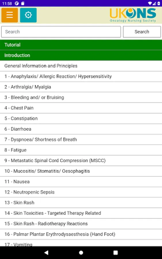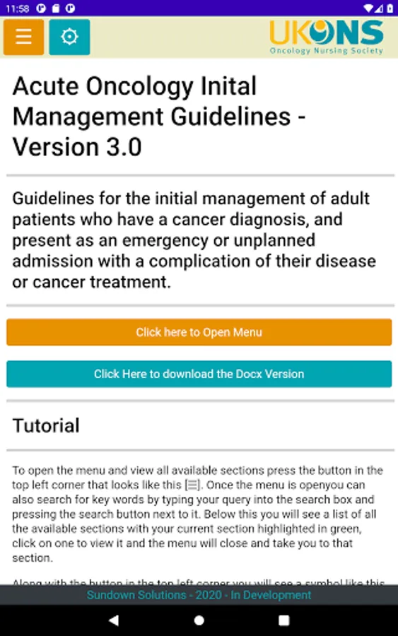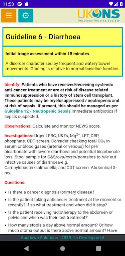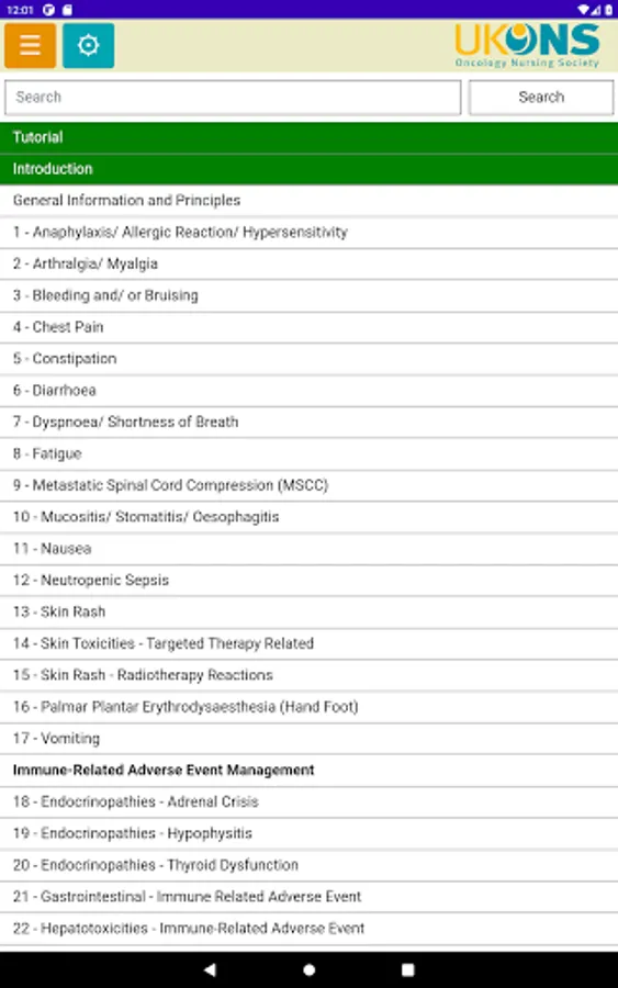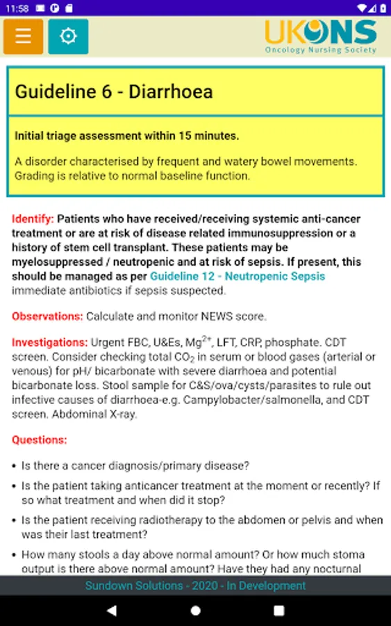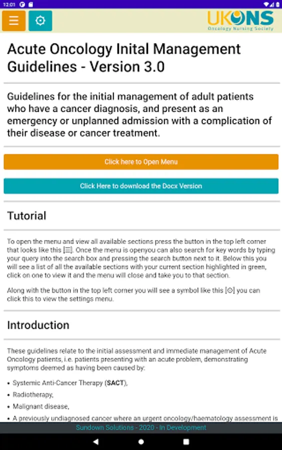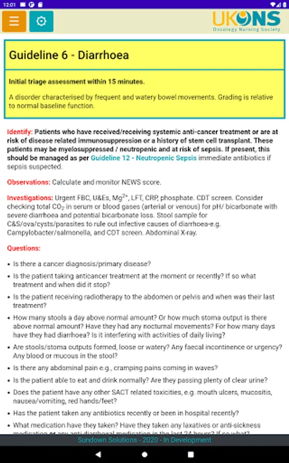 The information contained in these guidelines is a consensus of the development and consultation groups' views on current treatment. They should be used in conjunction with any local policies/ procedures/ guidelines and should be approved for use according to the trust clinical governance process. Care has been taken in the preparation of the information contained in the guidelines. Nevertheless, any person seeking to consult the guideline, apply its recommendations or use its content is expected to use independent, personal medical and/or clinical judgment in the context of the individual clinical circumstances, or to seek out the supervision of a qualified clinician. The United Kingdom Oncology Nursing Society makes no representation or guarantee of any kind whatsoever regarding the guidelines content or its use or application and disclaim any responsibility for its use or application in any way.