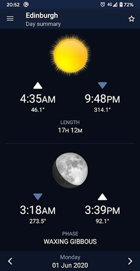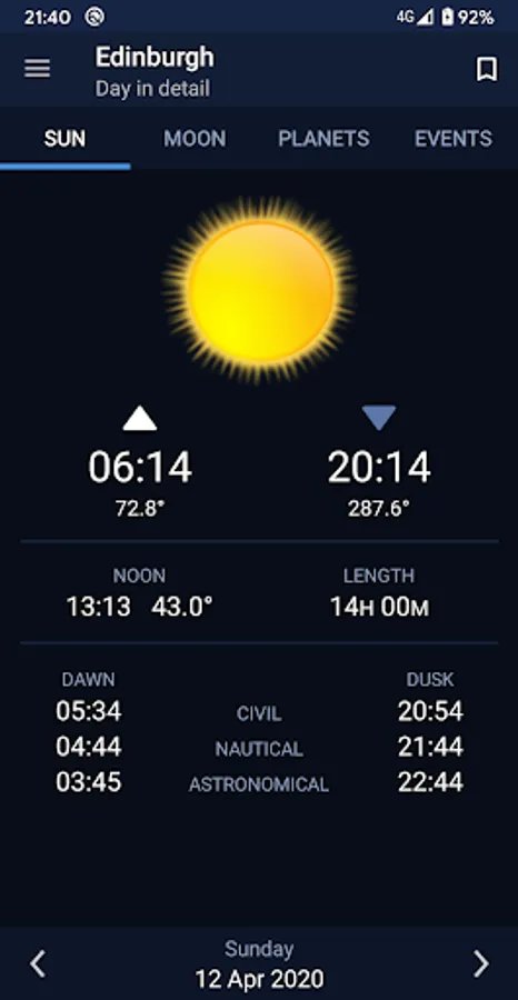 Sundroid calculates sunrise and sunset times, moonrise and moonset times, lunar phase, and planet rise and set times for any date and any location on Earth.
