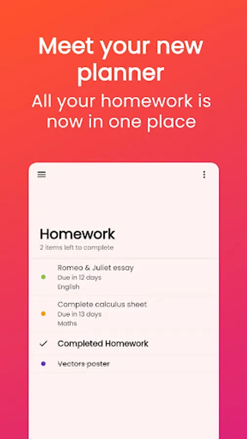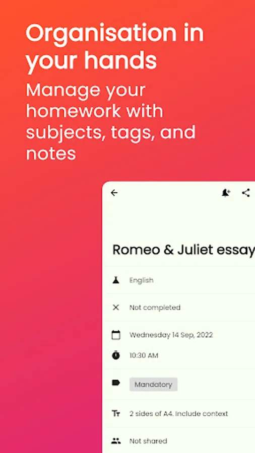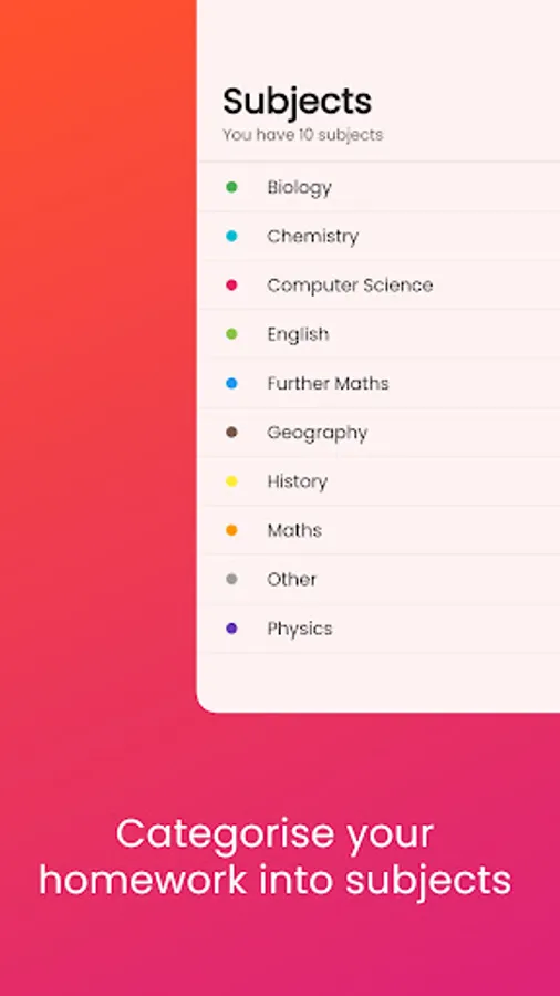 📂 Organise your homework however works best for you. Assign each piece to a subject, then add a note for extra detail. You can even tag each piece with custom tags.