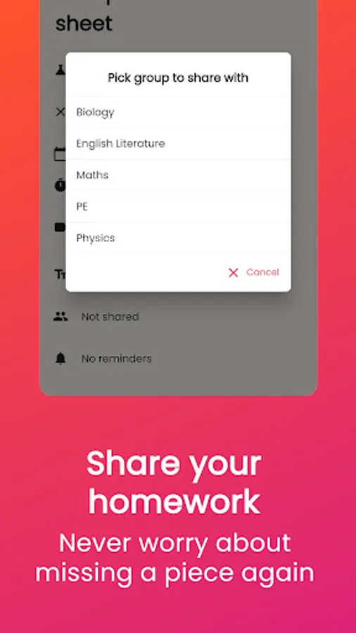 ✈️ Share your homework with your classmates so you don't even need to write it manually. Create a group and invite your friends and you're ready!