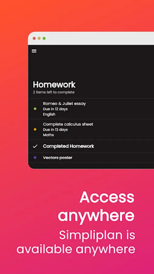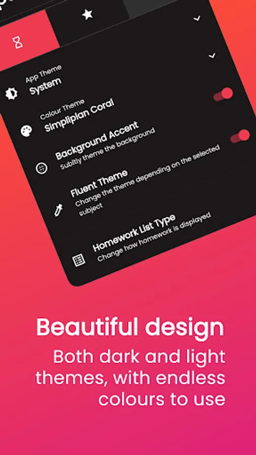 🎨 Simpliplan's beautiful design will let you focus on your homework. Choose from many colour themes and a light or dark theme for your personalised experience.