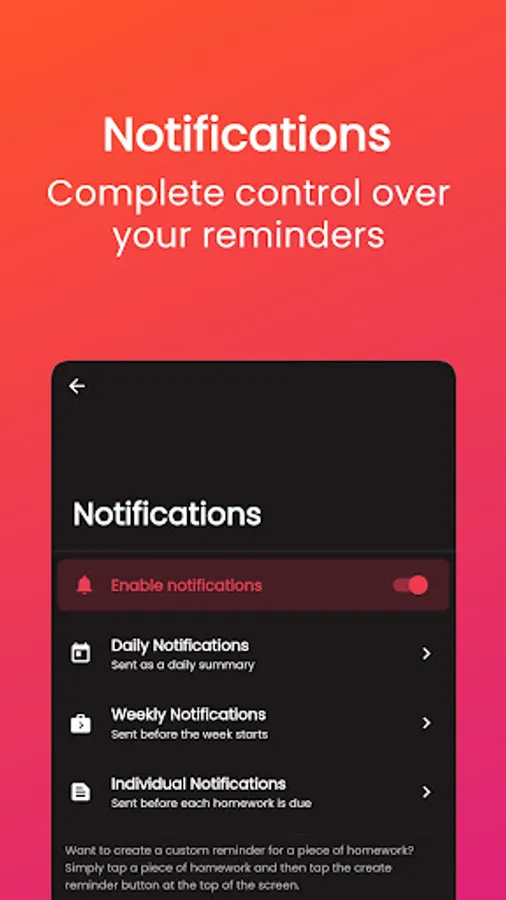 🔔 Multiple types of notifications can be individually customised and timed to help you keep track of your homework.