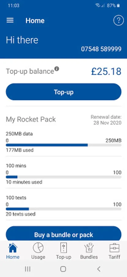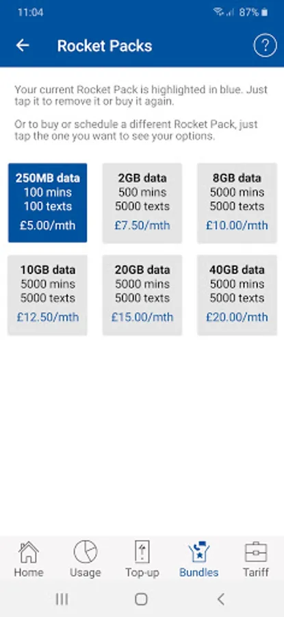 • See what you’ve got left of your Rocket Pack, free credit and data, minutes and texts bundles
